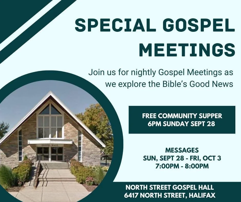 Special Gospel Meetings Sunday, September 28, 2025 7:00 p.m. 19:00 Friday, October 3, 2025 8:00 p.m. 20:00 North Street Gospel Hall 6405 North Street Halifax, Nova Scotia Canada (map) Google Calendar ICS